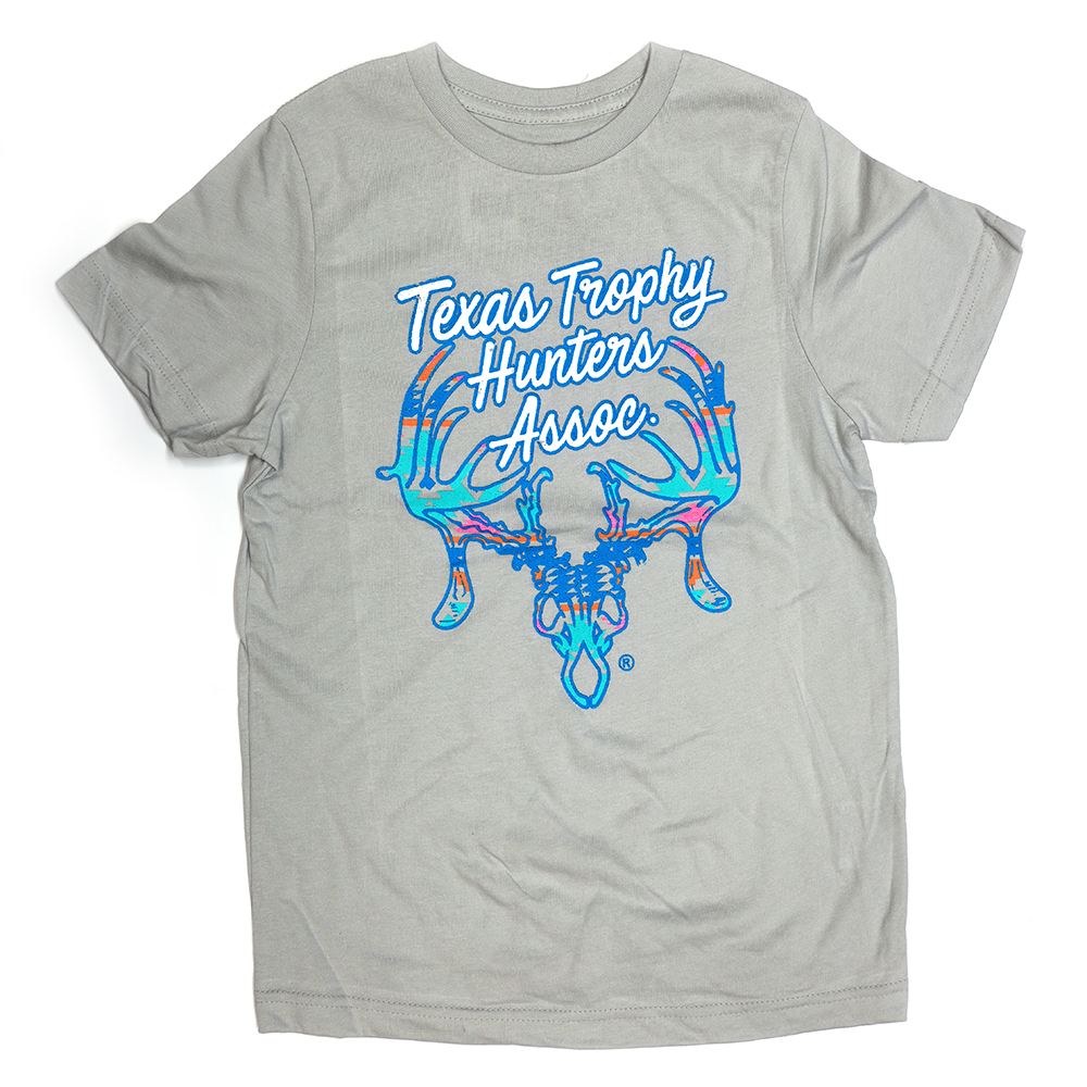 Light grey crewneck t-shirt with TTHA name and skull logo in fiesta colors stripes.