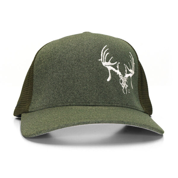 Richardson 6-panel trucker cap with TTHA Skull logo in white on the left panel. Bill and front panels are olive green as well as the mesh back. S/M one-size-fits-all.
