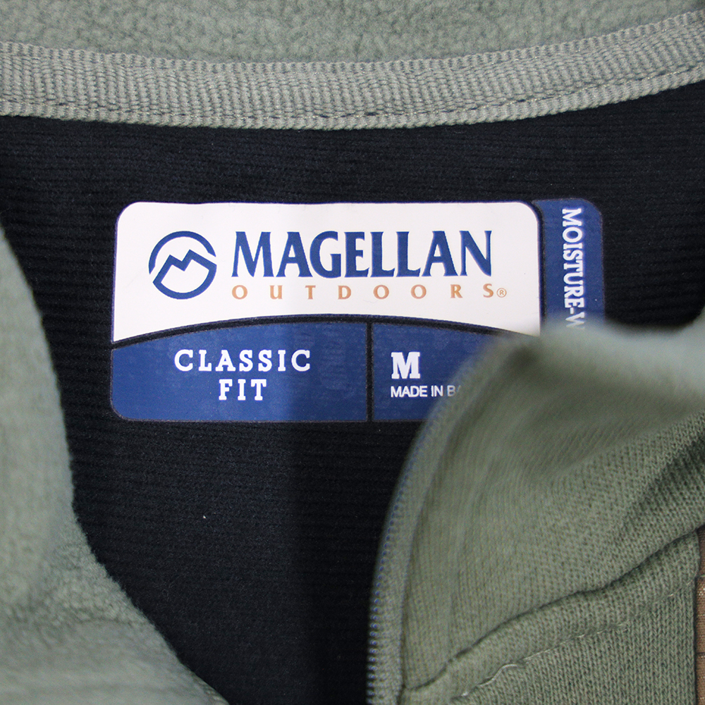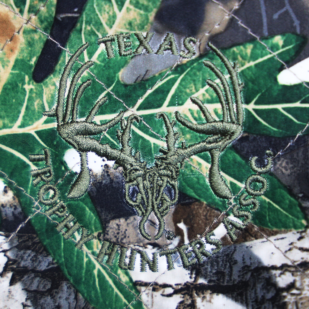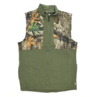 Olive green warm sweater vest with full zipper. REALTREE Edge camo pattern accents on breasts and back. TTHA logo on the right side in olive stitching. Classic fit.