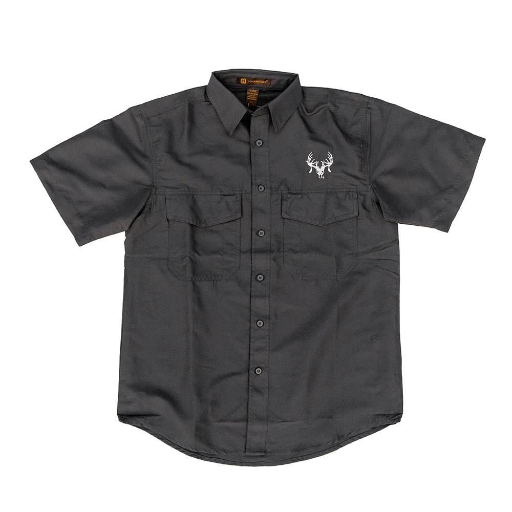 Harriton button-down shirt in dark grey gunmetal with two chest pockets. TTHA logo in white on the left chest.