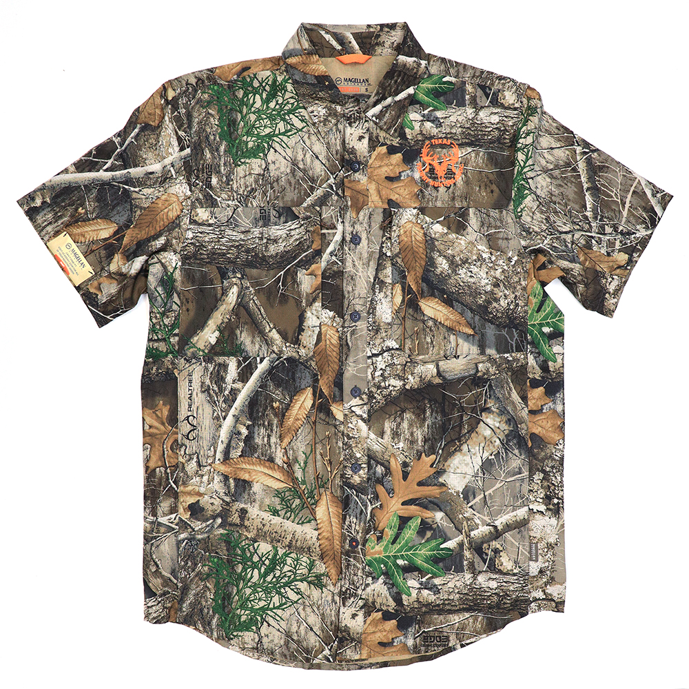 Magellan with REALTREE camo pattern on a button-down shirt. TTHA logo in orange on the left breast.