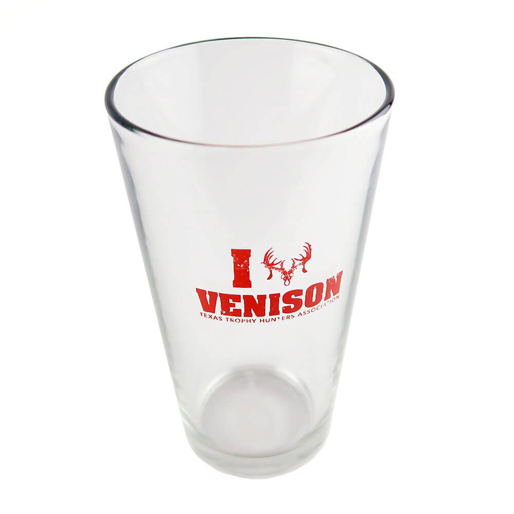 Mixing glass with “I Heart Venison” in red.