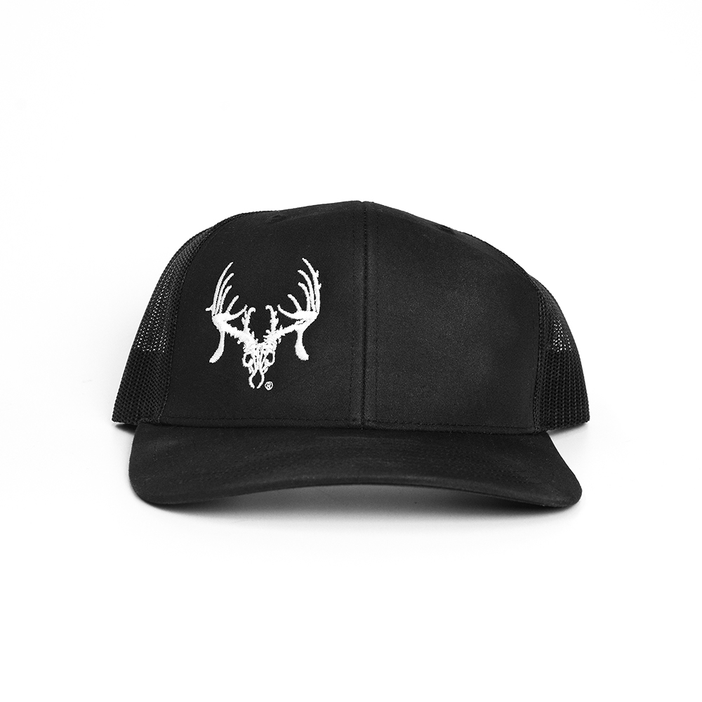Richardson 6-panel trucker cap with large round TTHA logo in white, black. Bill and front panels are black with black mesh with plastic size adjusters in the back, one-size-fits-all.