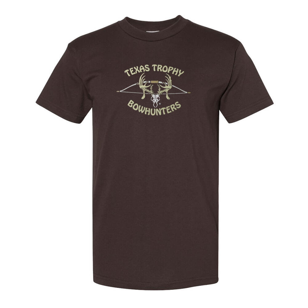 Chocolate brown t-shirt with the image on the front of the shirt with a bow and TTHA skull logo.