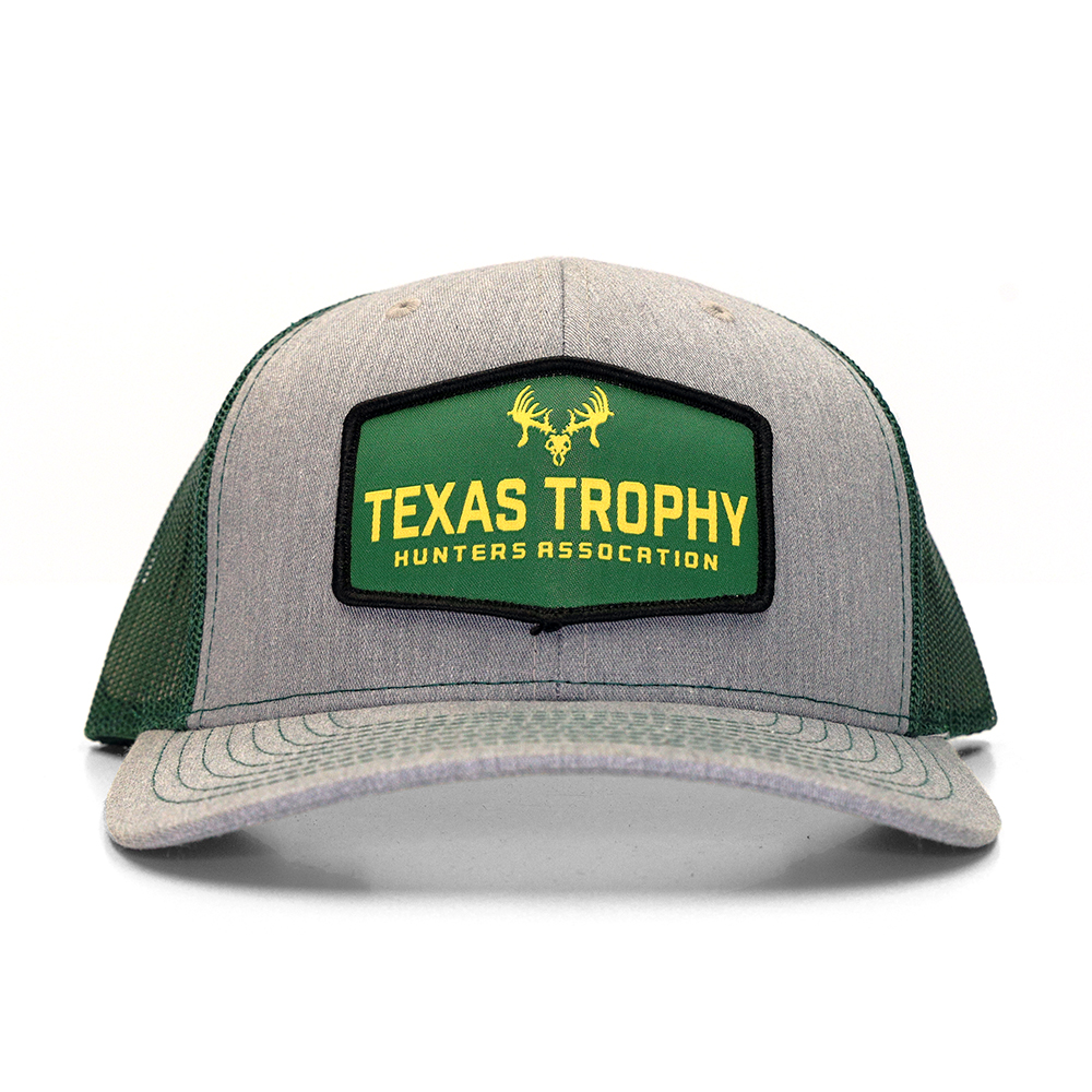Richardson 6-panel trucker cap with large green TTHA patch on a grey back panel and bill. Green mesh with plastic size adjusters in the back, one-size-fits-all.