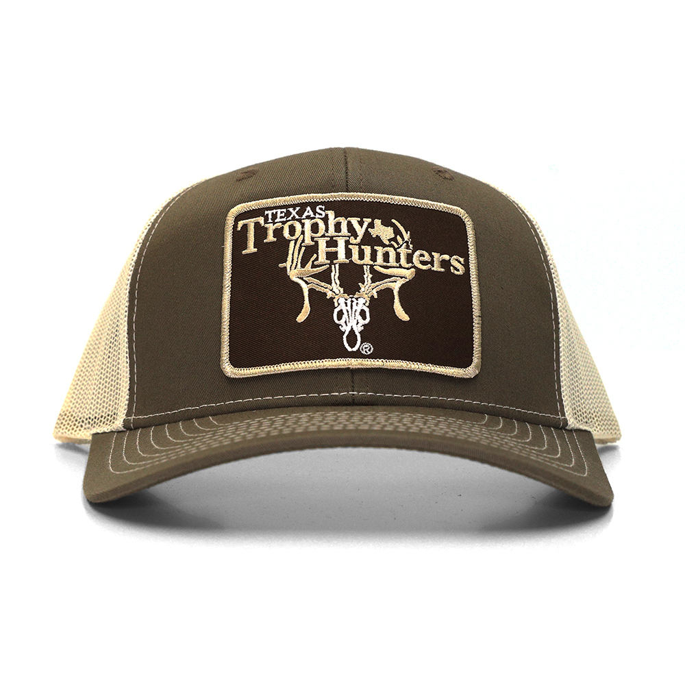 Richardson 6-panel trucker cap with a large green TTHA fabric patch logo on the center. Tan mesh with plastic size adjusters in the back, one-size-fits-all.