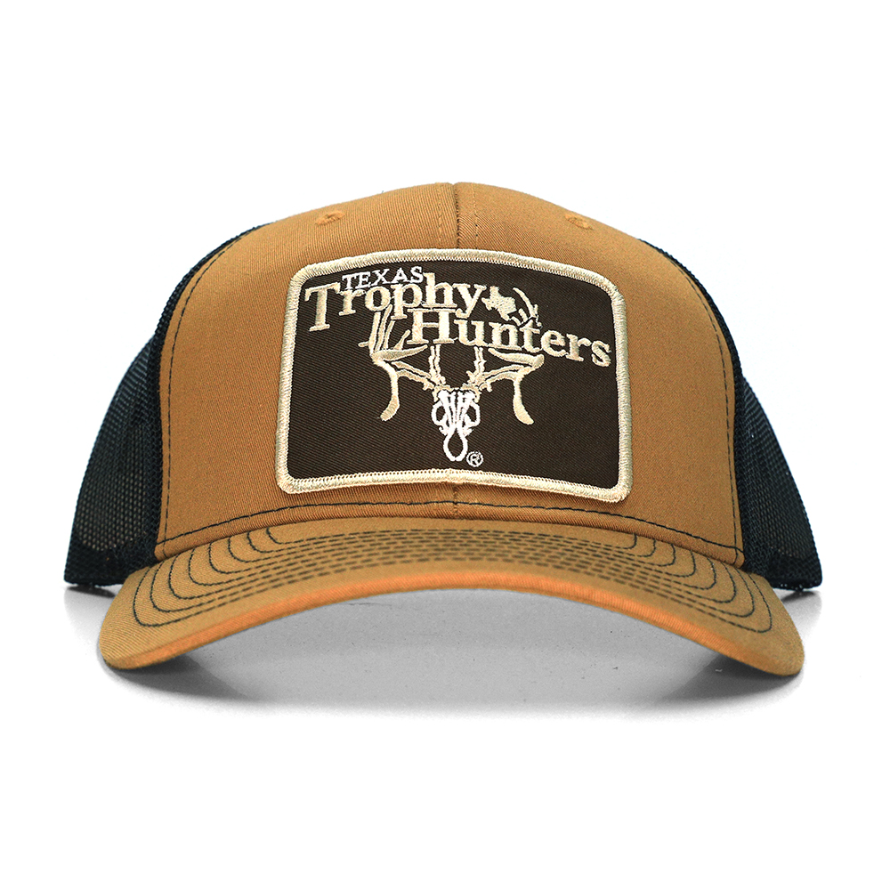 Richardson 6-panel trucker cap with a large brown TTHA fabric patch logo on the center. black mesh with plastic size adjusters in the back, one-size-fits-all.