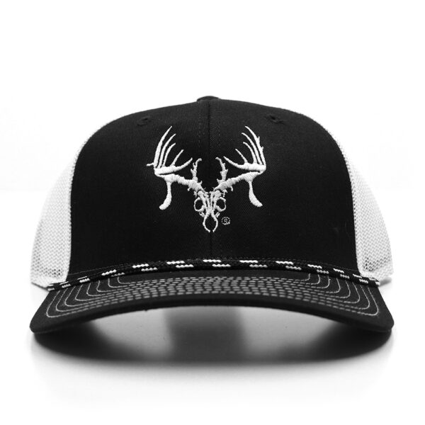 Richardson 6-panel trucker cap with a large white TTHA skull logo on the center panels. The bill and front panels are black with a black and white rope across the cap bill. White mesh with plastic size adjusters in the back, one-size-fits-all.