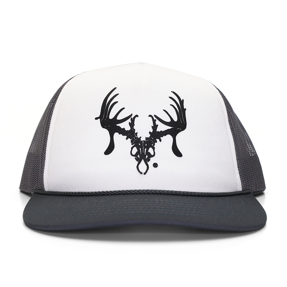 Foam cup trucker cap with TTHA skull logo in the center panel with black bill. Dark grey mesh with plastic size adjusters in the back, one-size-fits-all.