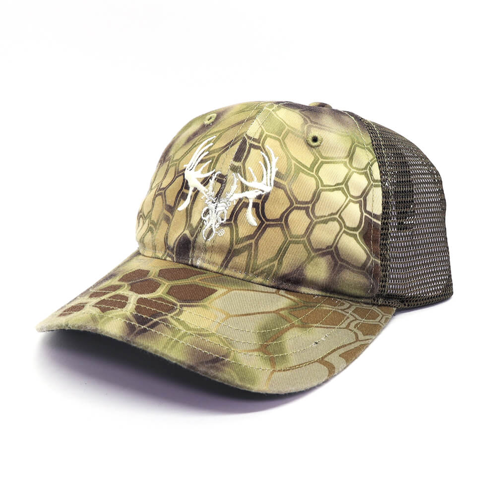Richardson Kryptek trucker cap with a large TTHA Skull in front in white. Kryptek boa pattern on the bill and front panels. Brown mesh with plastic size adjusters in the back, one-size-fits-all. Includes a new 1-year membership ONLY when purchased together with this product.
