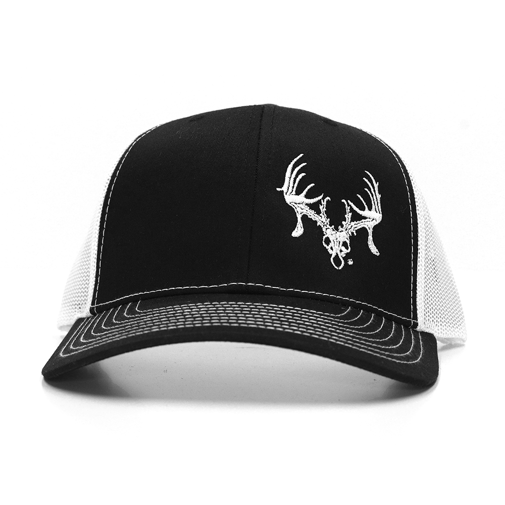 Richardson 6-panel trucker cap with TTHA skull logo on the right panel. White mesh with plastic size adjusters in the back, one-size-fits-all.