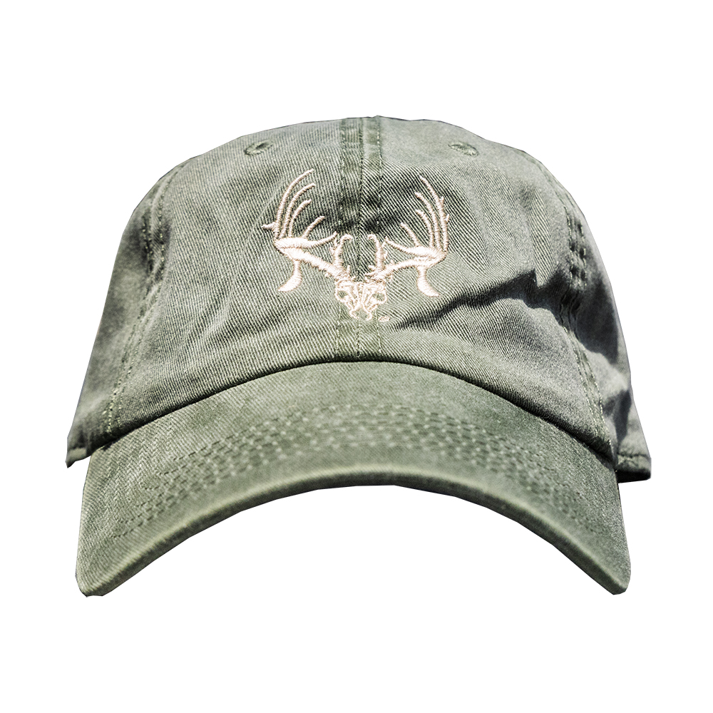 Cobra 6-panel soft “dad” cap with large tan TTHA Skull logo in the center. The whole cap is olive green “rag-washed” fabric. Cloth and buckle size adjuster in the back, one-size-fits-all.